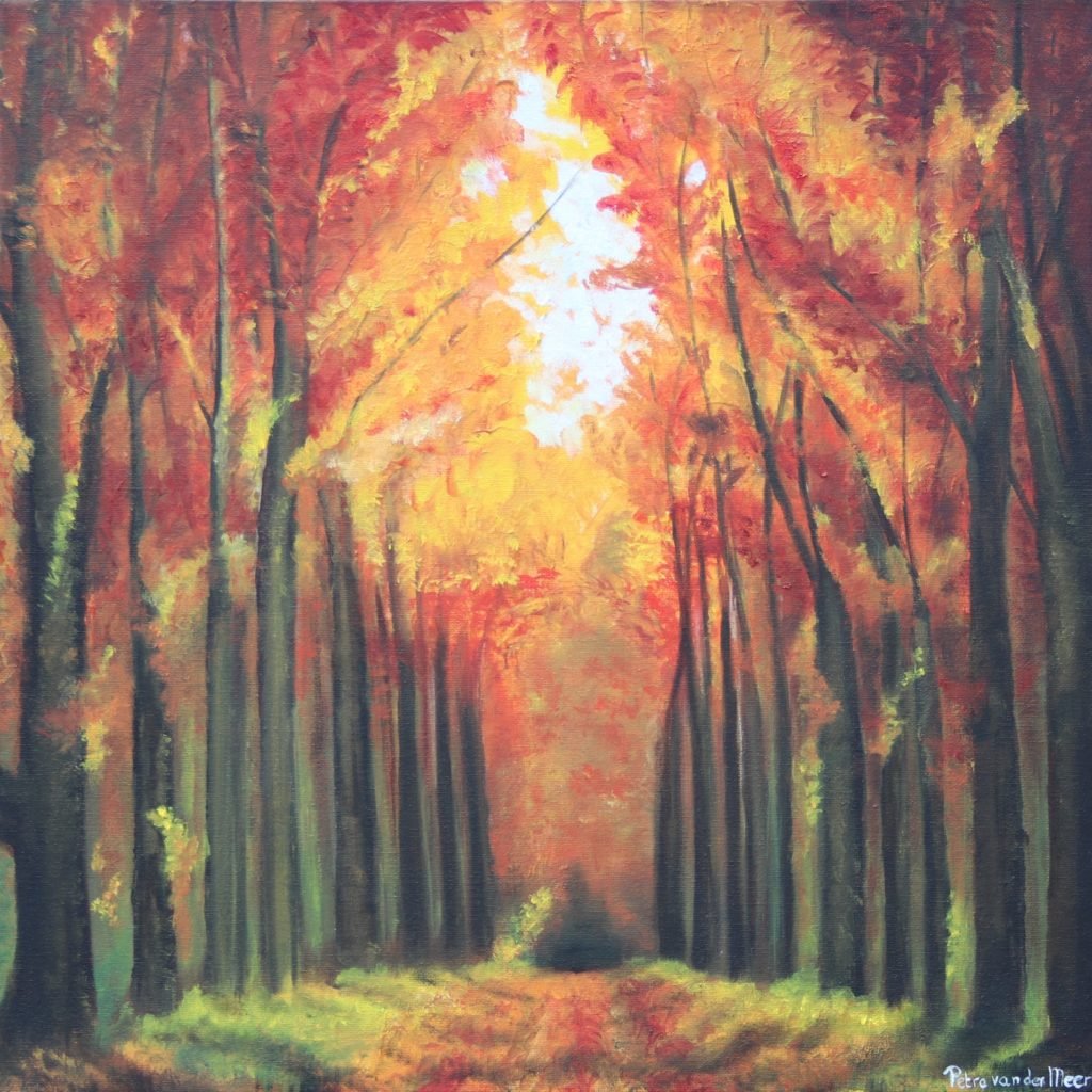 Zon in herfstbos | doek 40 x 40 cm | acrylverf | verkocht
